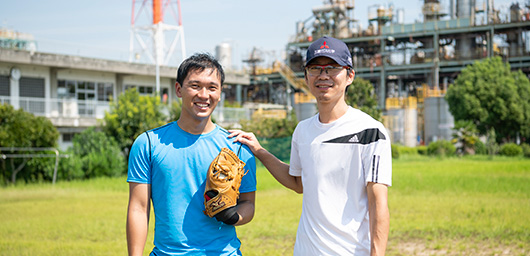 昼休みにグラウンドでキャッチボール。私は毎日工場内のグラウンドで昼休みにキャッチボールをします。お相手は社内の野球部のメンバーです。その人は私が担当しているプラントの運転員でもあります。ただ、昼休みはリフレッシュの時間にあてたいので、お互いに仕事の話はしません。そんなふうに昼休みを過ごしていますが、工場の夜景にも癒されています。残業やトラブル対応で夜まで工場に残っていると、子どもの頃に水島で見ていたコンビナートの夜景を思い出します。