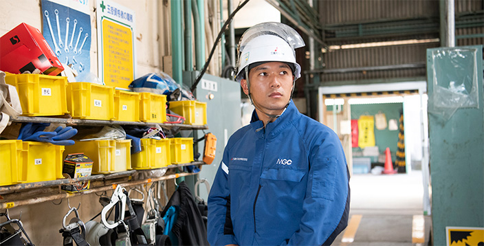 全うしたい。トラブルは起こってみないと対策が立てられない面もあります。しかしそこで思考停止するのではなく、MGCの他の工場の事例、四日市コンビナートの他社事例など、社内外のトラブル対応の情報を入手。より良い保全に活かす努力を重ねています。現在四日市工場は古いプラントの撤去、新プラントの誘致、増産などが行われ、大きな転換期を迎えているところです。私も数年後に導入予定の新プラントについて、部署内で連携してプロジェクトを進めています。完成を見届けられるのか分かりませんが、10〜20年後も安全操業できるような、次の保全担当者に誇れる仕事を全うしたいと考えています。社内外のトラブル対応事例を集め、より良い保全に活かす。