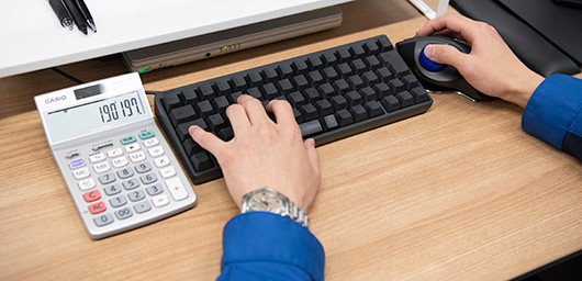 デスクスペースの有効活用に成功。経理の仕事は紙資料が多いので、デスクのスペースをできるだけ確保したいところです。そこで私は、テンキーがついていない小型のキーボードを使用しています。ファンクションキーを押したままにすれば文字キーで数字入力ができるように、配置をカスタマイズしました。また、マウスもトラックボールを搭載したものに交換。腕を動かさなくてすむので、デスクが有効活用できます。ガジェットが好きな私は、すべて自前で調達しています。