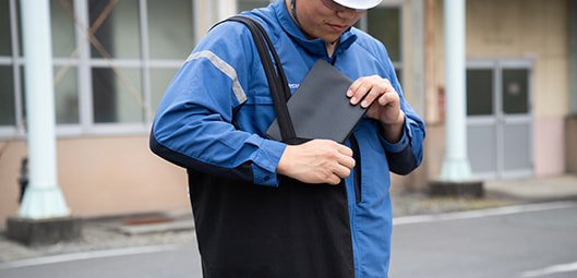 ショルダーバッグが便利私の必須アイテムはショルダーバッグです。現場で両手が塞がってしまうと危険なため、安全かつ軽快に動けるように、両手を空けられるショルダーバッグを導入しました。中には図面や資料をすぐに確認・作成するためのパソコンとマウス、その他の資料、飲み物などを入れて持ち運んでいます。緊急時に必要な資料をすぐに出せるようにする「保険」の役割も果たしています。安全かつ効率的に業務を遂行するために、今や欠かせないアイテムです。